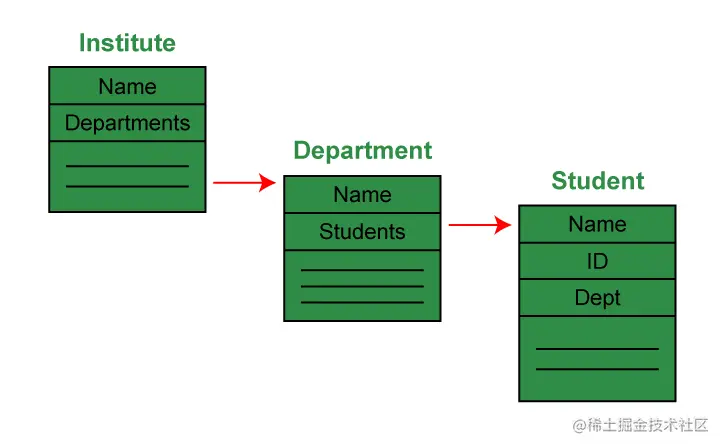 输出 解释。在这个例子中,有一个学院有很多系,如CSE和EE。每个系都有一些学生。因此,我们建立了一个学院类,它有一个对系类的对象或对象数量(即对象列表)的引用。这意味着学院类通过其对象与系类相关联。而系类也有对学生类的对象或对象(即对象列表)的引用,这意味着它通过其对象与学生类相关联。这代表了一种Has-A关系。在上面的例子中。学生有一个名字。学生有一个ID。学生有一个部门,部门有一个学生,正如下面的媒体所描述的。