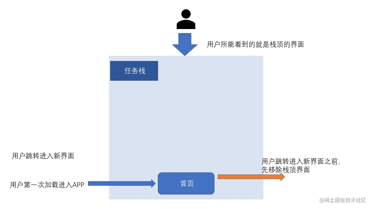 解决这个问题就是在每次跳转到新的界面的时,都先销毁当前界面,就是让它出栈,图示如下: