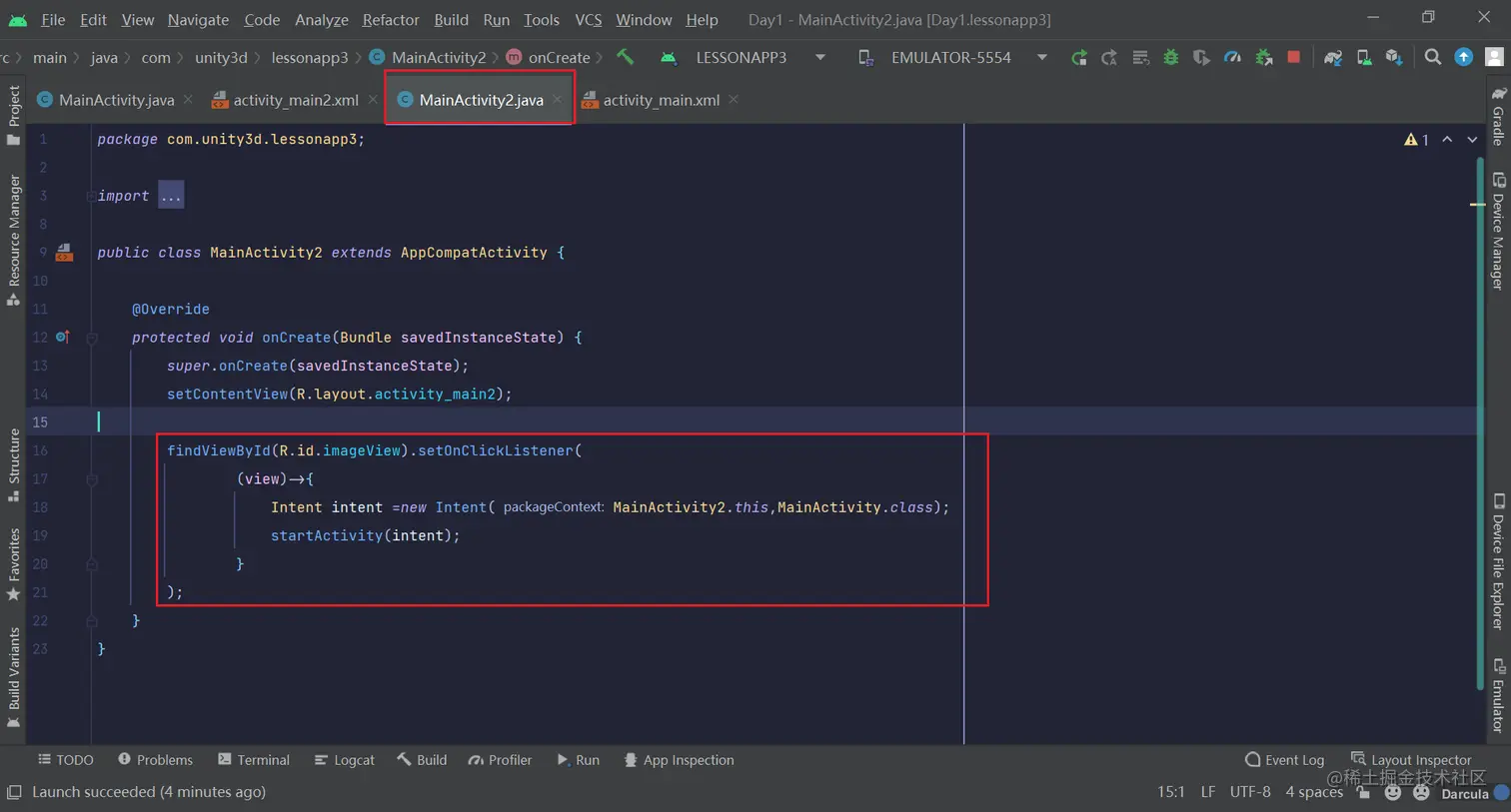 在MainActivity2的布局界面中我创建了一个id为imageView的组件,通过它绑定监听实现跳转