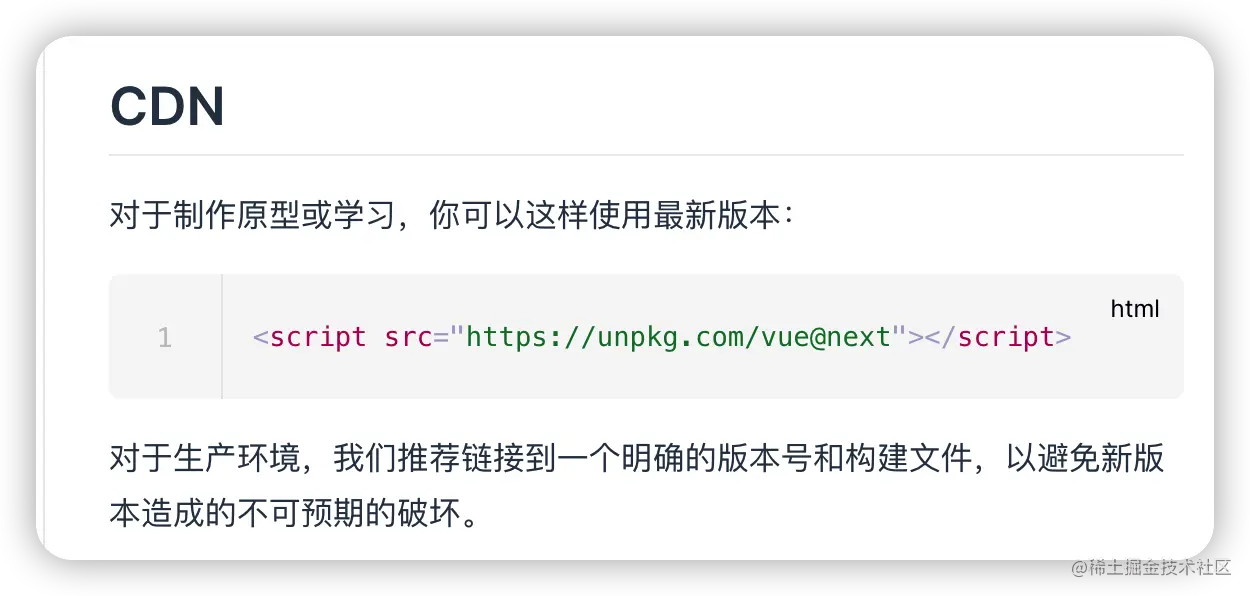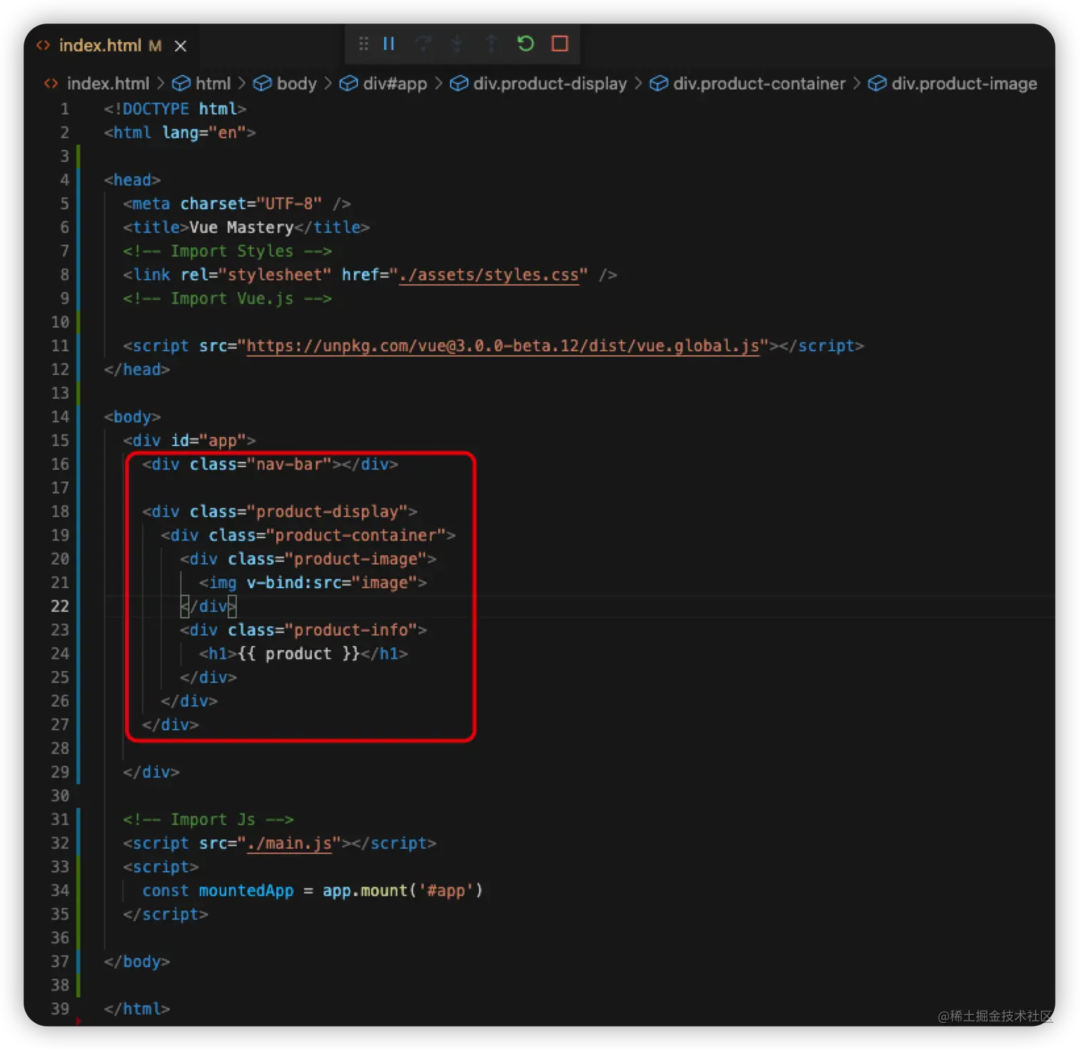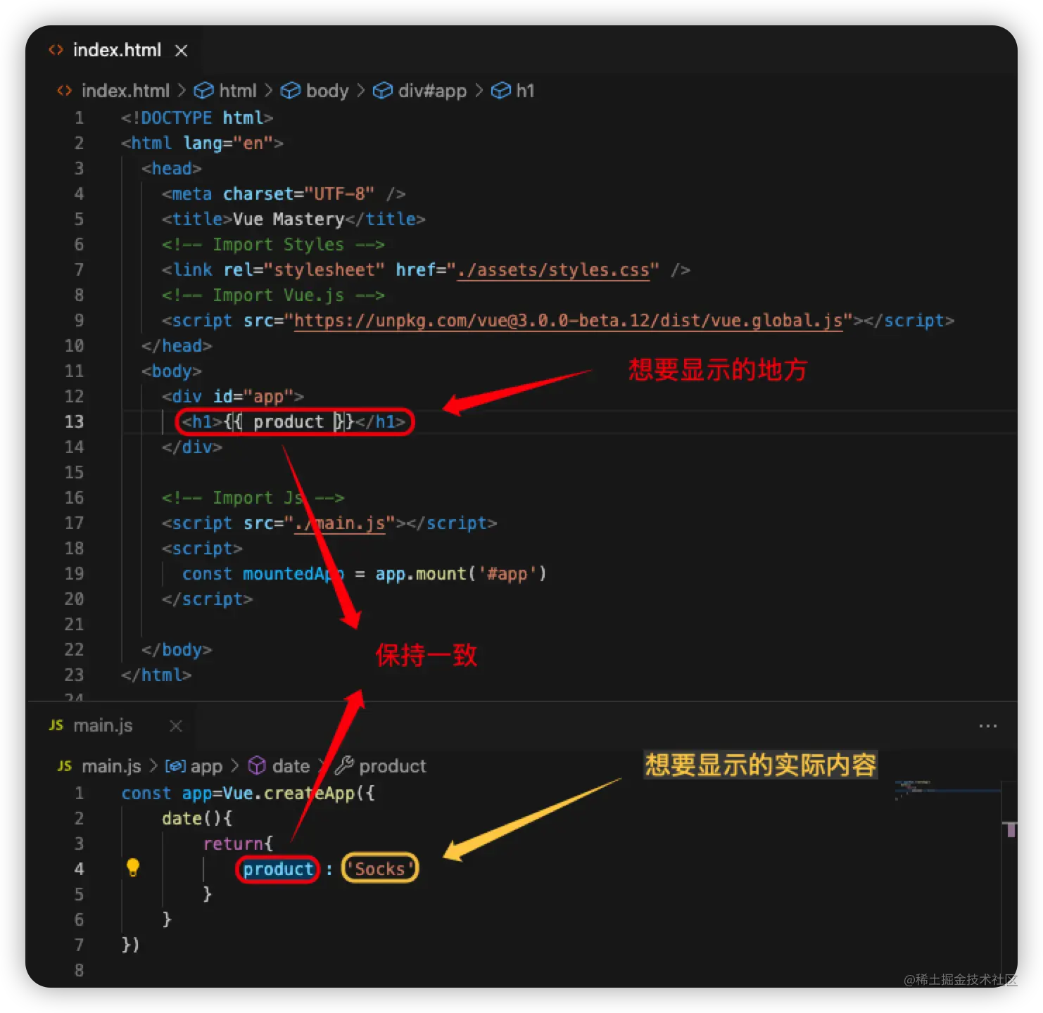 <!DOCTYPE html> <html lang="en"> <head> <meta charset="UTF-8" /> <title>Vue Mastery</title> <!-- Import Styles --> <link rel="stylesheet" href="./assets/styles.css" /> <!-- Import Vue.js --> <script src="https://unpkg.com/vue@3.0.0-beta.12/dist/vue.global.js"></script> </head> <body> <div id="app"> <h1>{{ product }}</h1> </div> <!-- Import Js --> <script src="./main.js"></script> <script> const mountedApp = app.mount('#app') </script> </body> </html> -