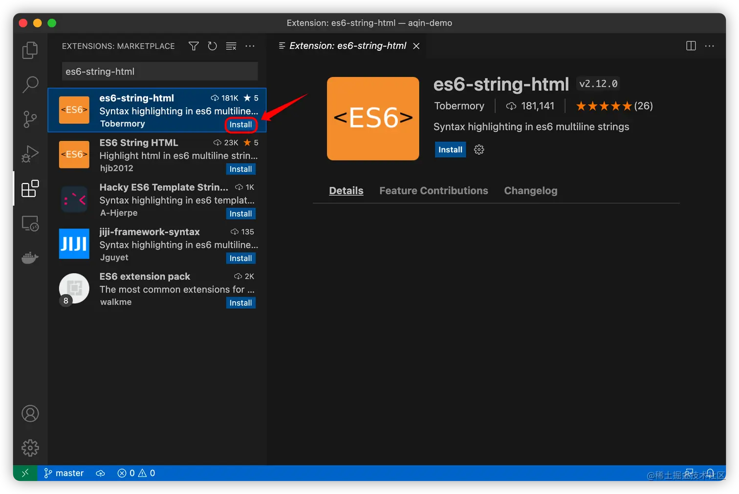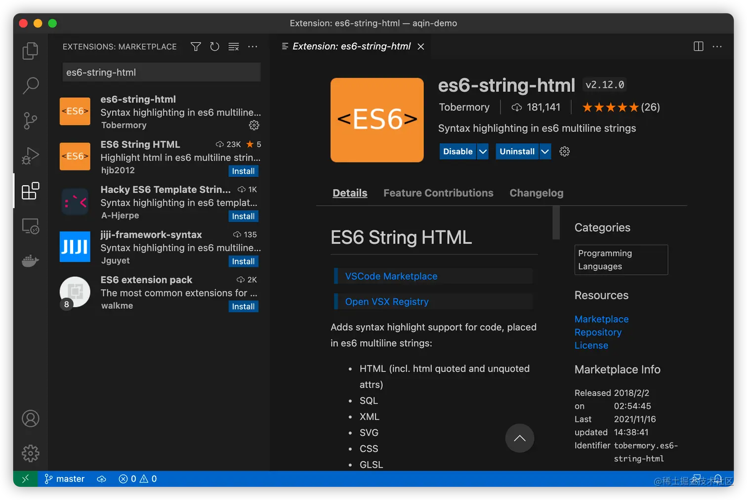 - 官网的第一课中,建议安装es6-string-html插件