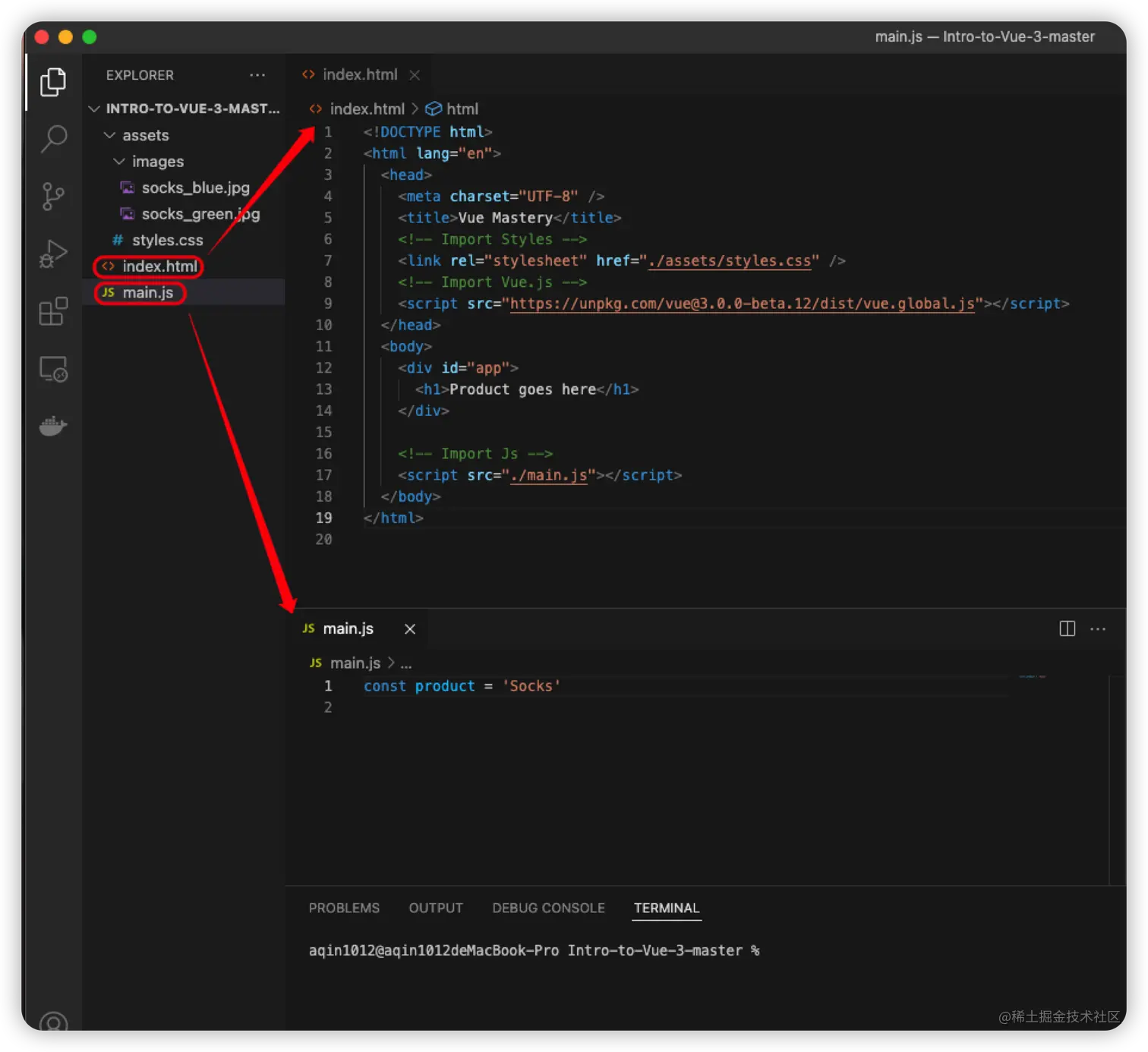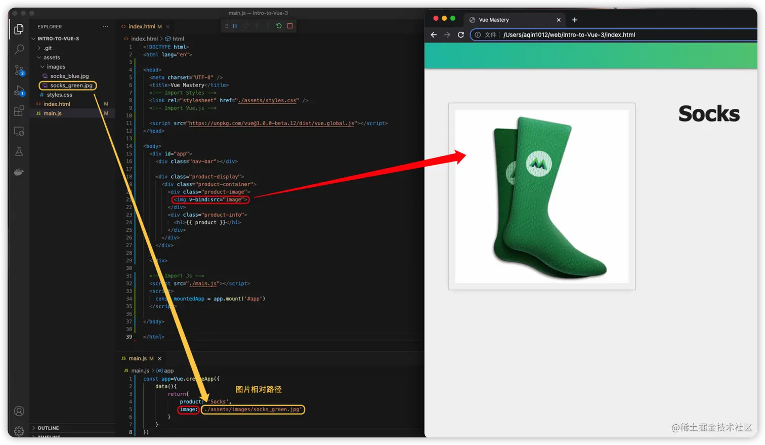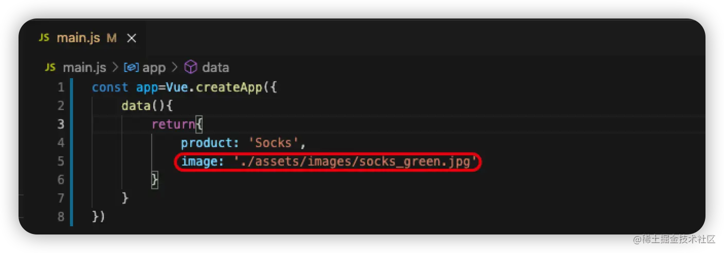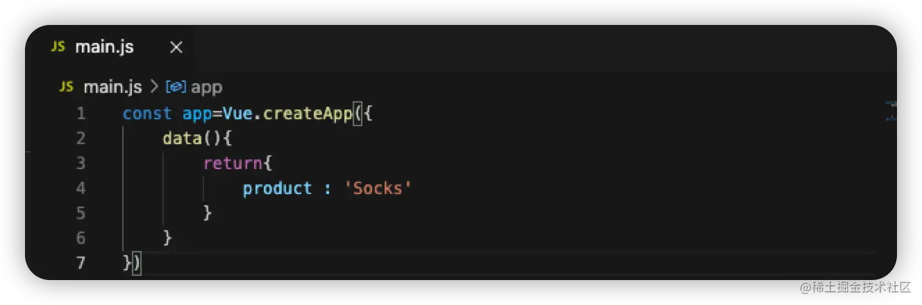 const app=Vue.createApp({ data(){ return{ product: 'Socks', image: './assets/images/socks_green.jpg' } } }) -