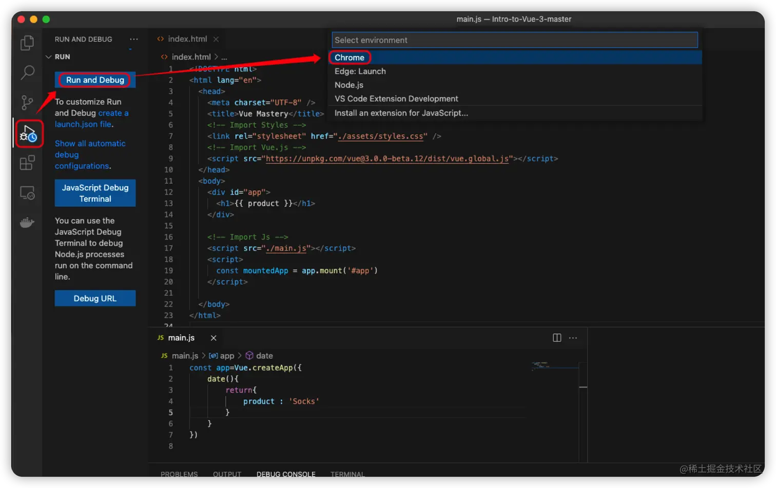 const app=Vue.createApp({ data(){ return{ product : 'Socks' } } }) -