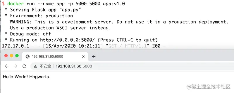 我们可以通过 docker run 命令启动我们自己构建的镜像噢。最后通过浏览器访问 http://你的IP:5000 来访问启动的服务。