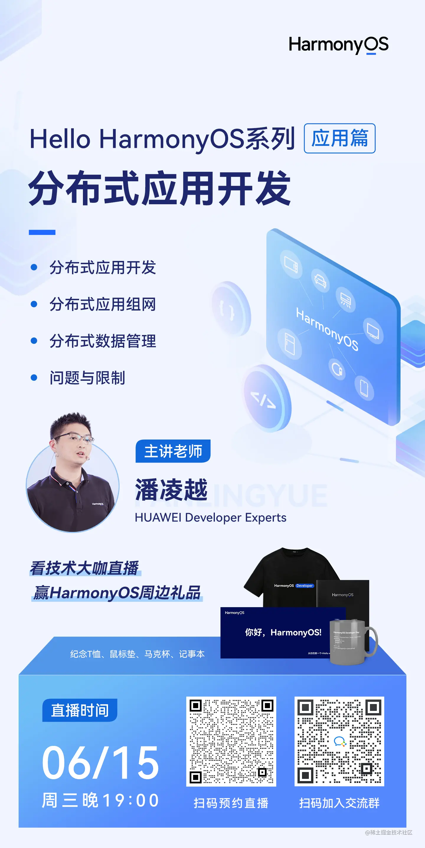 分布式应用开发知多少,马上扫码预约直播,不容错过的最后一节课!整个系列课程下来不少同学都把HarmonyOS周边全家桶抱回家了,末班车的礼品大放送已到站,快上车呀开发者们~