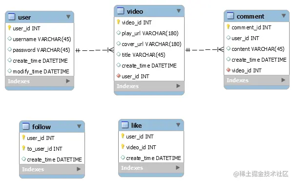 - comment存储评论信息,含有comment_id, user_id, content, create_time, video_id。其中video_id作为外键连接video和comment,由于video和comment存在一对多的关系。