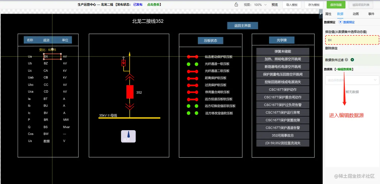 1.在场景中选中要绑定数据的组件,右侧弹出【属性框】,选择【数据】选项,点击数据集的【编辑数据集】。