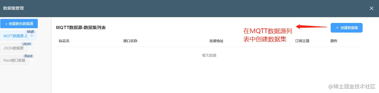 3.创建好后,在左边的数据源树中点击刚创建的数据源“MQTT数据源”进入到数据集列表中。