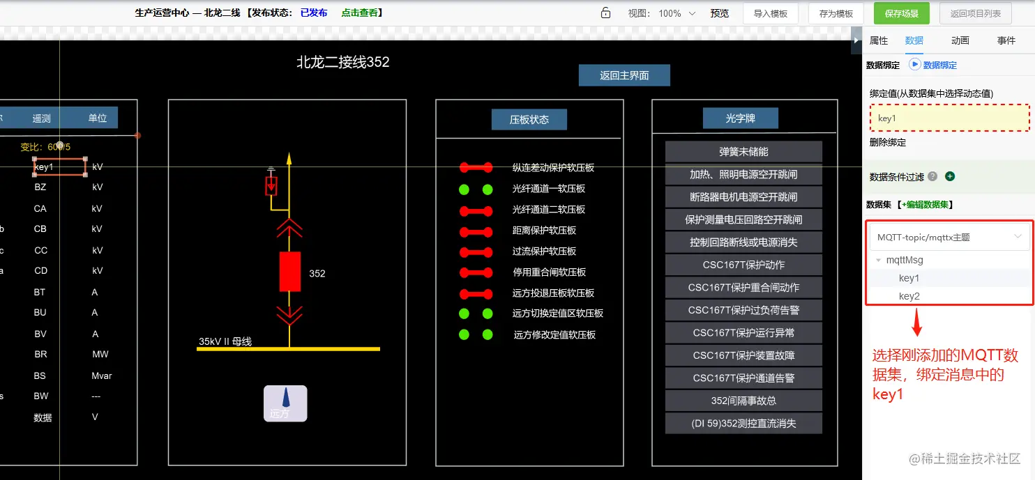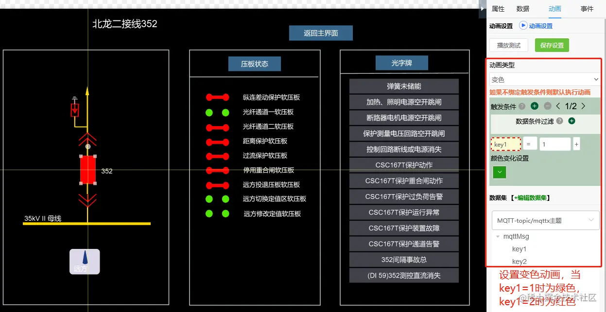 5.给组件绑定数据,这里测试给一个文本组件绑定MQTT返回的数据中的key1和给一个矩形配置改变颜色的动画(当key1=“1”为绿色,当key1=“2”时为红色)。