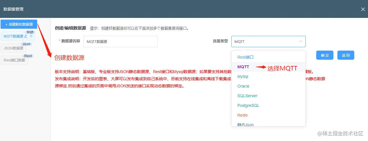 2.进入【数据集管理】界面,点击 【创建新的数据源】 ,这里将【数据源名称】命名为“MQTT数据源”,【连接类型】选择“MQTT”。