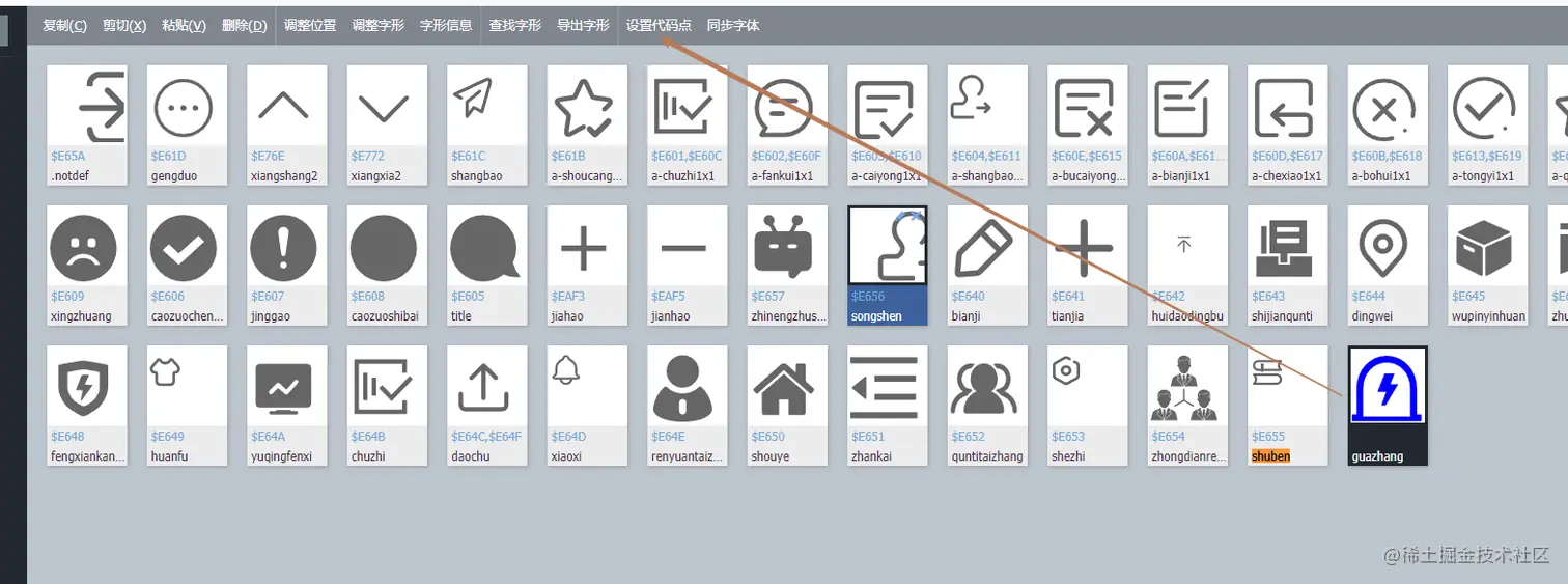 选中刚刚添加的字形,点击上方【设置代码点】按钮