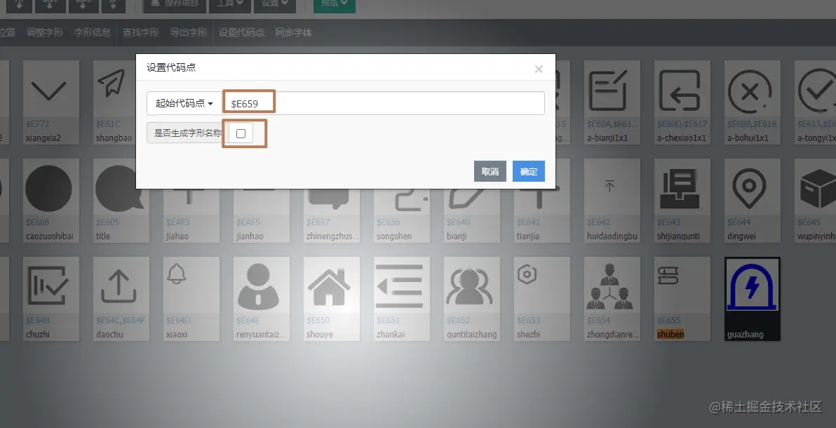 为字形设置码点,该码点格式参考其他图标,后三位数字可随意设置,只要不与已存在的其它图标的码点重复即可,并且取消勾选【是否生成字形名称】,然后确定