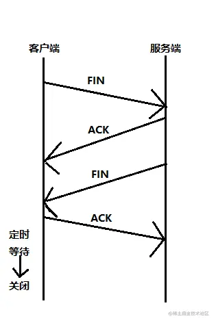 - 第四步,客户端返回确认报文段(ACK置为1),并进入定时等待,最后连接关闭,两边用于该连接的资源全被释放。