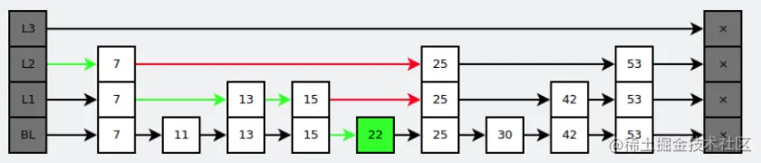 跳跃表是基于多指针有序链表实现的,可以看成多个有序链表。