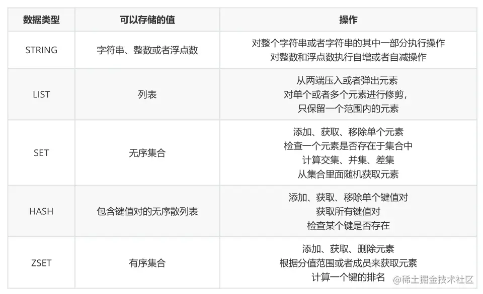 键的类型只能为字符串,值支持五种数据类型:字符串、列表、集合、散列表、有序集合。