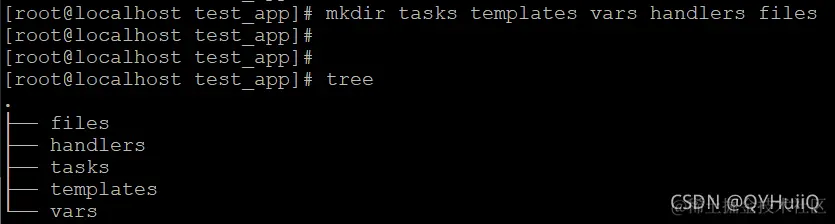 首先在roles下面创建一个我们要实现的项目的目录,这里我们就将目录名命名为test_app,再在test_app下面创建多个执行任务所需要的各种类别的专用目录: