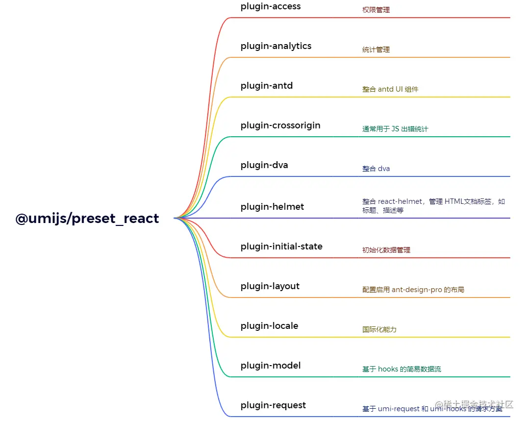 在 UmiJS 脚手架中默认安装了针对 React 应用的插件集,即 @umijs/preset_react ,包含了如下丰富的功能: