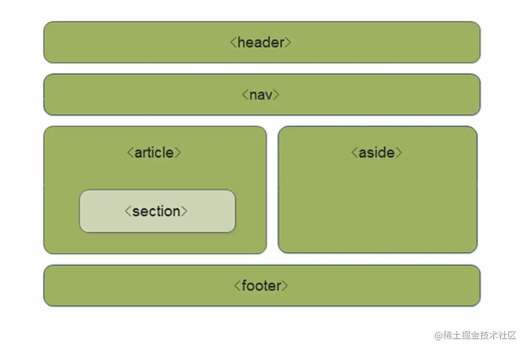 <header>:头部标签<nav>:导航标签<artical>:内容标签<section>:定义文档某个区域<aside>:侧边栏标签<footer>:尾部标签