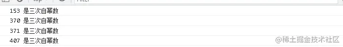 for (var i = 100; i <= 999; i++) { var a = parseInt(i / 100); var b = parseInt(i % 100 / 10); var c = i % 10; if (a ** 3 + b ** 3 + c ** 3 === i) { console.log(i + ' 是三次自幂数'); } }