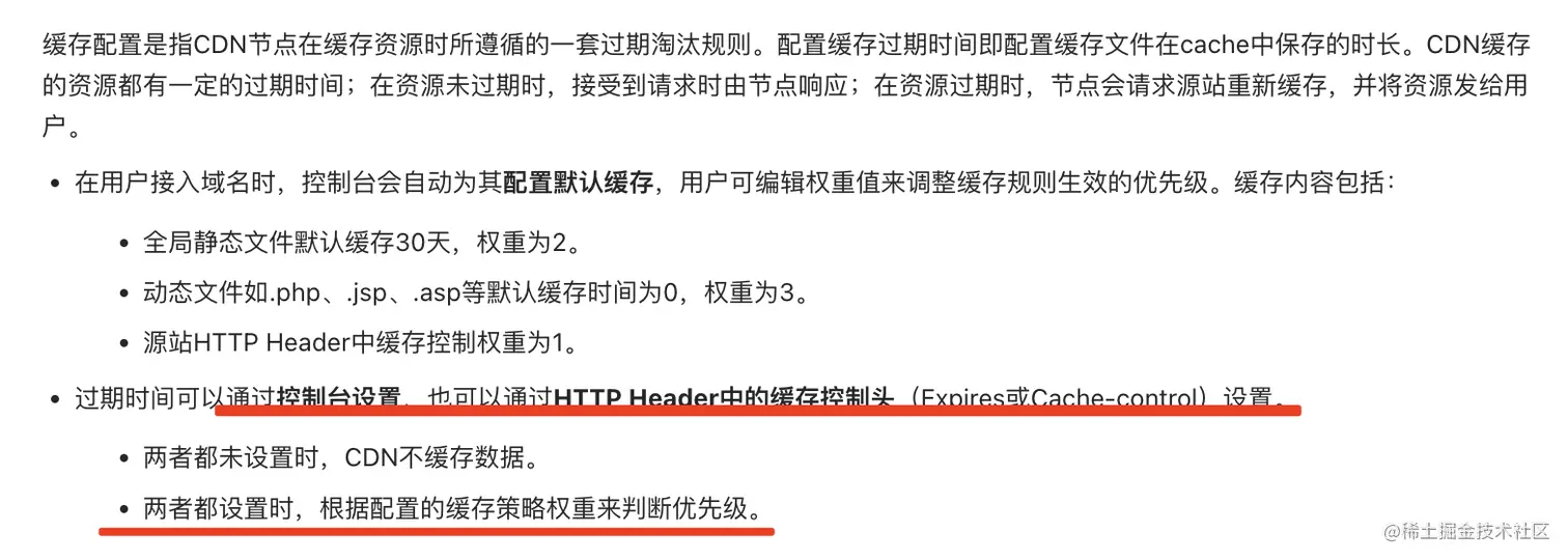 CDN 服务会有一个控制台,可以设置不同资源的缓存时间,当然,请求的 header 里也有 expries 和 Cache-Control 来控制缓存时间,这俩的生效的优先级也是可以设置的。