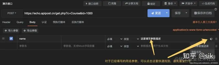 如图中所示,对于一个填写过的参数,我们可以在新建接口可以通过点击参数描述后面的♦️方块标志快速导入描述,不用重复打字。