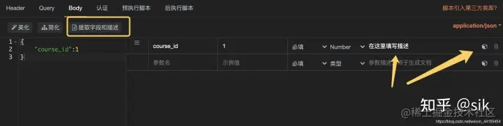 对于raw类型的body参数,我们可以通过点击“提取字段和描述”来针对参数进行描述的填写: