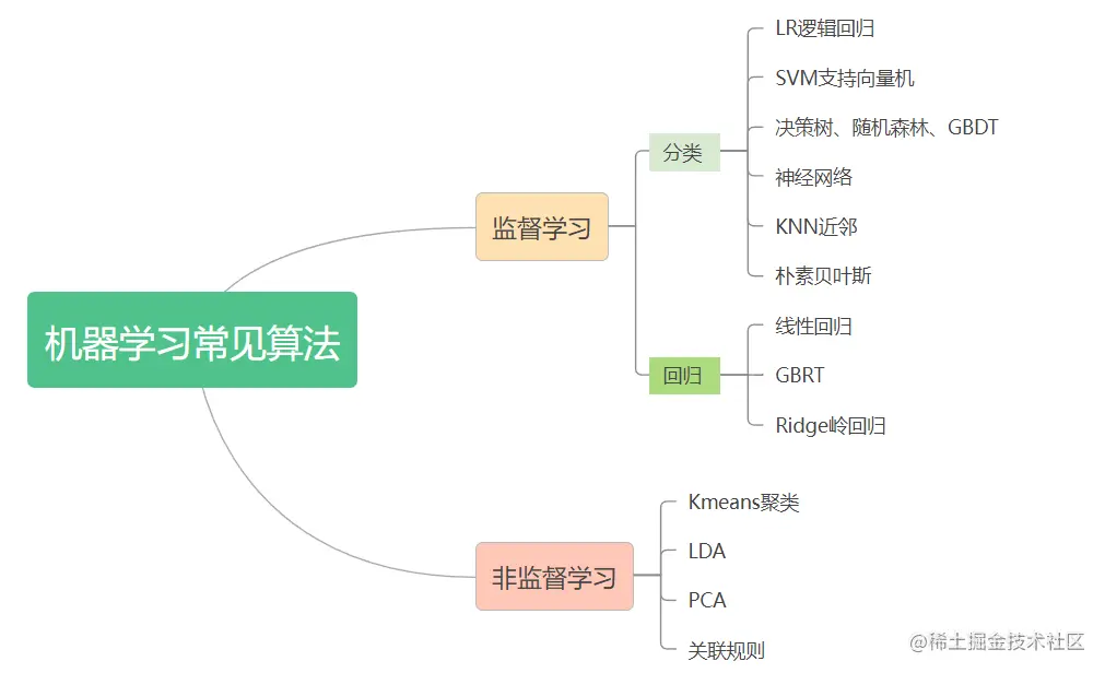 - 监督学习:包含分类和回归两大类。常见的算法有LR、树算法、神经网络和GBRT等,其中