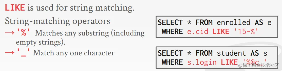Like用于字符串匹配,%和_是常见的字符串匹配运算符