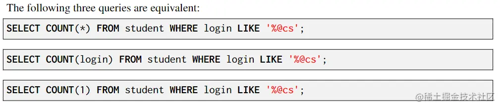 这一部分表示如果是全选的话,星号、表名和1都是一样的意思,并且LIKE中%表示匹配任意数字,但是尽量不要用在最前面,因为这样DBMS不知道要匹配的是什么数字,依然会将整个表遍历一遍,很难优化。