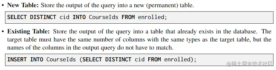 将查询的结果重新到已有的一张表里或者创建一个新表,而不是直接输出到客户,这种操作就叫做输出重定向,有如下图所示的两种方式