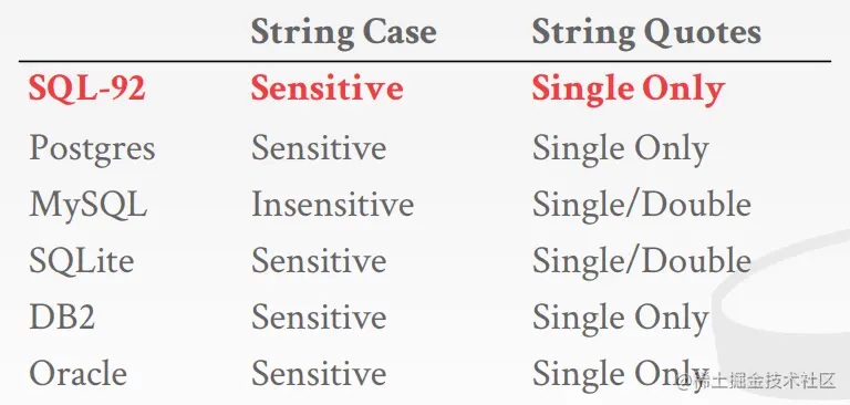 在不同的数据库中字符串的操作是有不同规定的,以下是一些数据库中字符串大小写和单双引号的使用规范