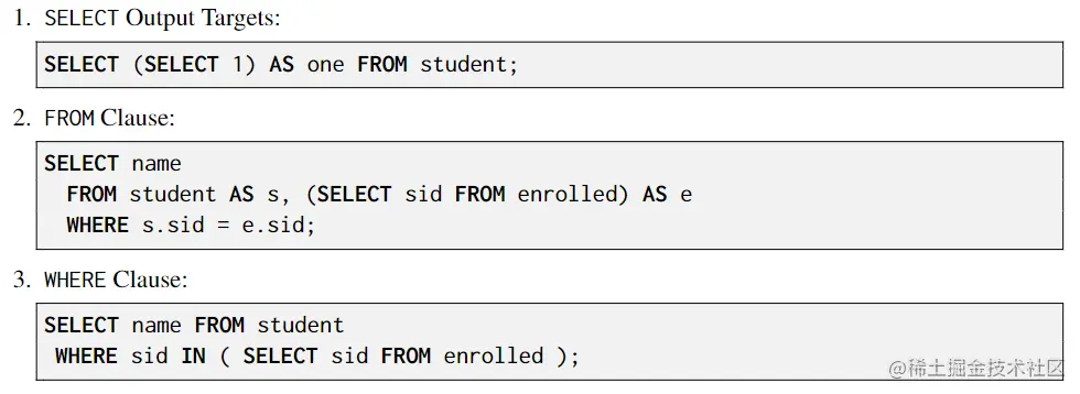 子查询的意思就是将查询语句嵌套在查询语句中,在结构上和输出重定向很像。外部查询的范围包含在内部查询中(即,内部查询可以从外部查询访问属性),但不能反过来。内部查询几乎可以出现在查询的任何部分: