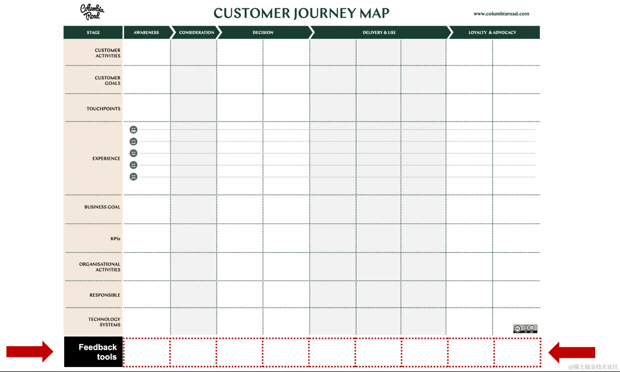 下面这个来自哥伦比亚路的模板是一个很好的起点。我只是添加了一个新的维度--反馈工具--以便能够将反馈活动与旅程阶段联系起来。还有一些你不一定认为是反馈或研究工具的活动。然而,在收集信息方面有令人难以置信的丰富实践,我将在下一点中介绍其中的一些。
