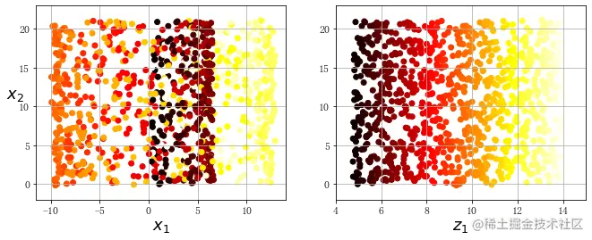 图2 瑞士卷投影到平面(左图)和直接将瑞士卷在2维空间展开(右图)
