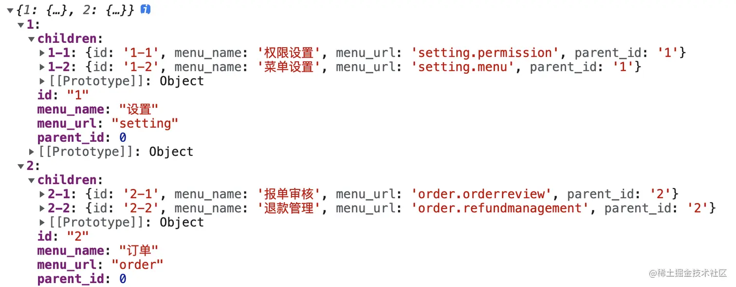 parent_id属性不为0,则我们可以用这个parent_id去找到temp[parent_id]这个父节点,并将其加入到该父节点的children属性中(若无则新增该属性) - 遍历结束时,即可得到所需要的对象