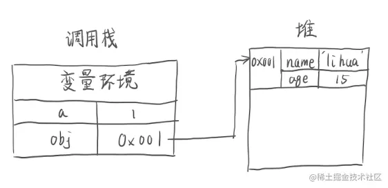 比如这么一段代码,它在内存中的结构如下图所示,obj在堆中存放,如果我们只进行浅拷贝,实际拷贝的是它在堆中的地址,任何改变都会引起堆中数据的改变。