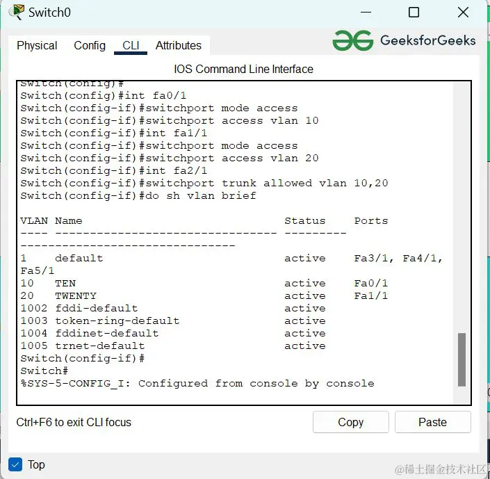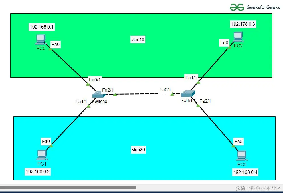 例如,我们已经创建了两个虚拟局域网组vlan10和vlan20,所以我们必须以这样的方式配置交换机,以便我们能够与VLANs组下的设备进行通信。 在VLAN20中,如果我们ping PC0中的PC3 IP地址,那么我们肯定会得到回复,但如果我们试图ping不同VLAN组的IP地址,那么我们会得到一个错误,因为它属于不同VLAN组。