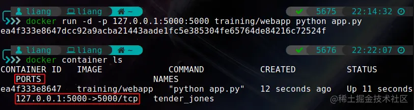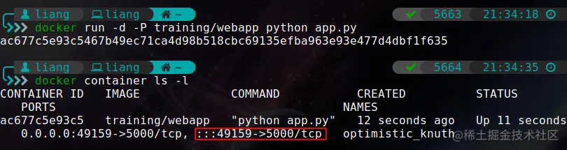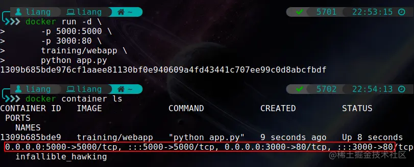 执行完上面指令,使用docker container ls命令就可以看出绑定了两组端口: