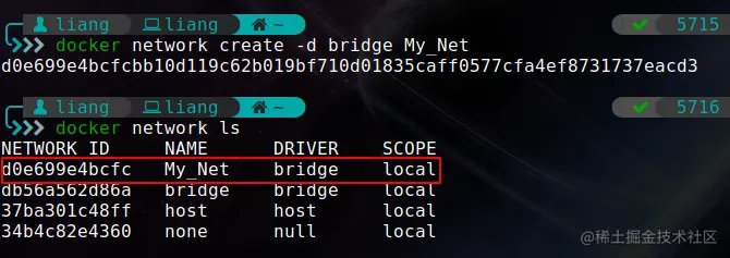 其中,-d指定了docker的网络类型为bridge类型,并自定义docker网络的名称为My_Net。如下图所示,可以使用docker network ls查看系统的docker网络: