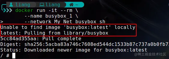 如下如所示,由于本地没有busybox:latest镜像,所以首先从远程镜像仓库拉取镜像,再创建连接的docker网络My_Net的容器busybox_2: