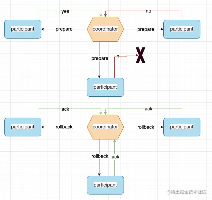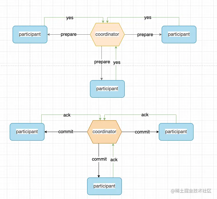 两阶段提交协议(2PC),在说两阶段提交一些前,先说两个概念,在分布式系统中,为了让每个节点都能够感知到其它节点的事务执行情况,需要引入一个中心节点来统一处理所有节点的执行逻辑,这个中心节点叫做协调者(coordinator),被中心节点调度的其它业务节点叫做参与者(participant)