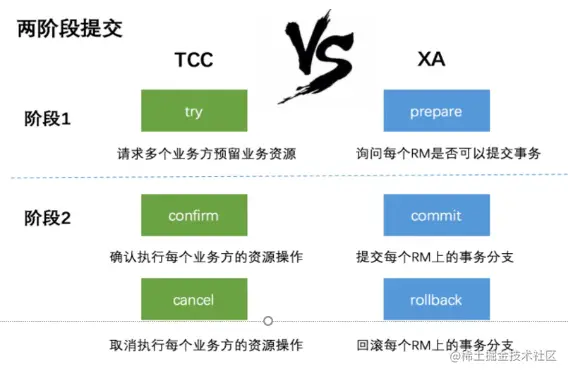 两阶段是事务管理器(TM)和资源管理器(RM)形成的预提交和提交两个阶段。