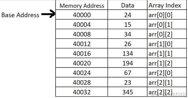 这里,基地址是多维数组的地址或存储在多维数组中的第一个对象的地址。内存地址增加4个字节(int数据类型的大小)。