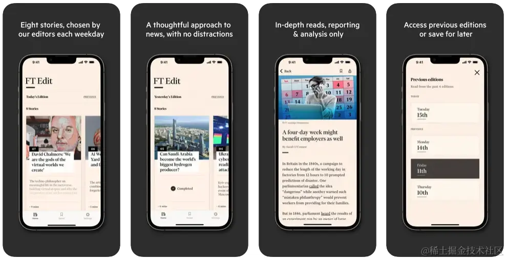 - FT Edit - 这是是英国《金融时报》前两个月发布的一款新应用,每天都会发布精心挑选的八个重要金融时报的内容。界面交互是设计的很好看,和官网很统一。