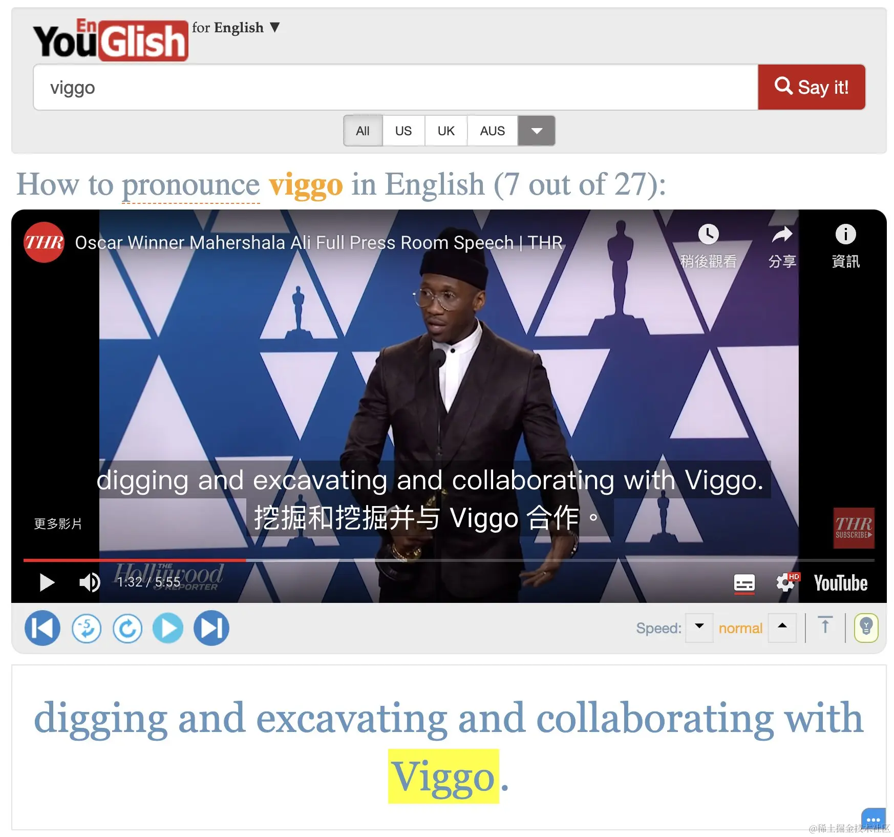 - YouGlish - 这是一个非常有用的学英语的网站,太强了!可以随便搜索一个单词,这网站会在 Youtube 上搜索包含这个单词的视频句子,你可以重复听,练习真正的 Native Speaker 发音。也可以选择各种类型的发音,当然也可以学习其他语言。