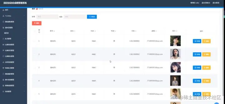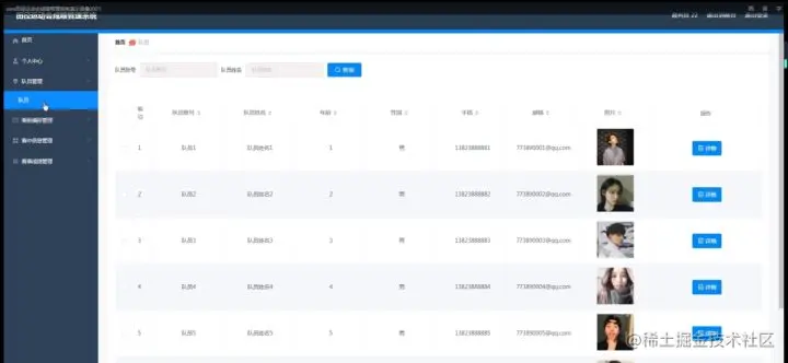 队员管理,在队员管理页面中可以对索引、队员账号、队员姓名、年龄、性别、手机、邮箱、照片等信息进行详情等操作,如图5-20所示。