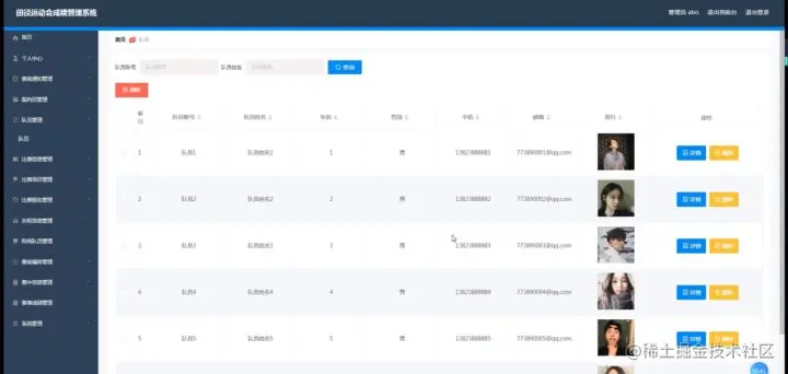 队员管理,在队员管理页面中可以对索引、队员账号、队员姓名、年龄、性别、手机、邮箱、照片等信息进行详情、删除等操作,如图5-7所示。