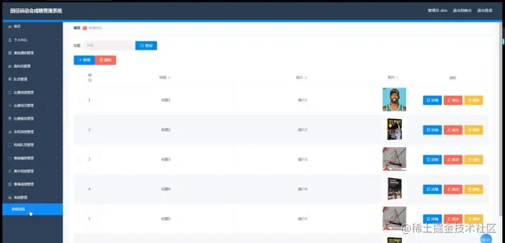 赛前通知管理,在赛前通知管理页面中可以对索引、通知标题、简介、封面、发布人、发布时间等信息进行详情,修改或删除等操作,如图5-5所示。