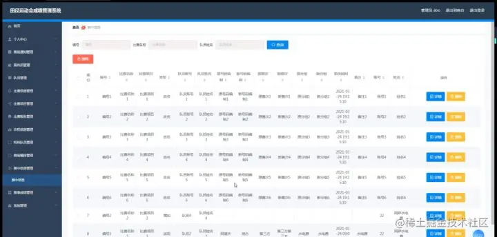 管理员登录进入系统之后,就可以对所有的信息进行查看,可以查看到首页、个人中心、赛前通知管理、裁判员管理、队员管理、比赛信息管理、比赛项目管理、比赛报名管理、弃权信息管理、特殊队员管理、赛前编排管理、赛中信息管理、赛事成绩管理、系统管理等,并且还可以对其进行相应的操作管理,如图5-4所示。