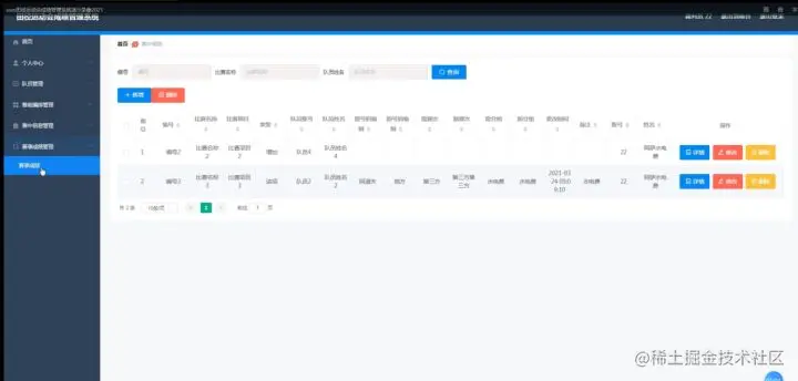 赛事成绩管理,在赛事成绩管理页面中可以对索引、编号、比赛名称、结束时间、队员账号、队员姓名、赛事成绩、赛事排名、得到奖项、登记时间、账号、姓名等信息进行详情、修改或删除等操作,如图5-23所示。